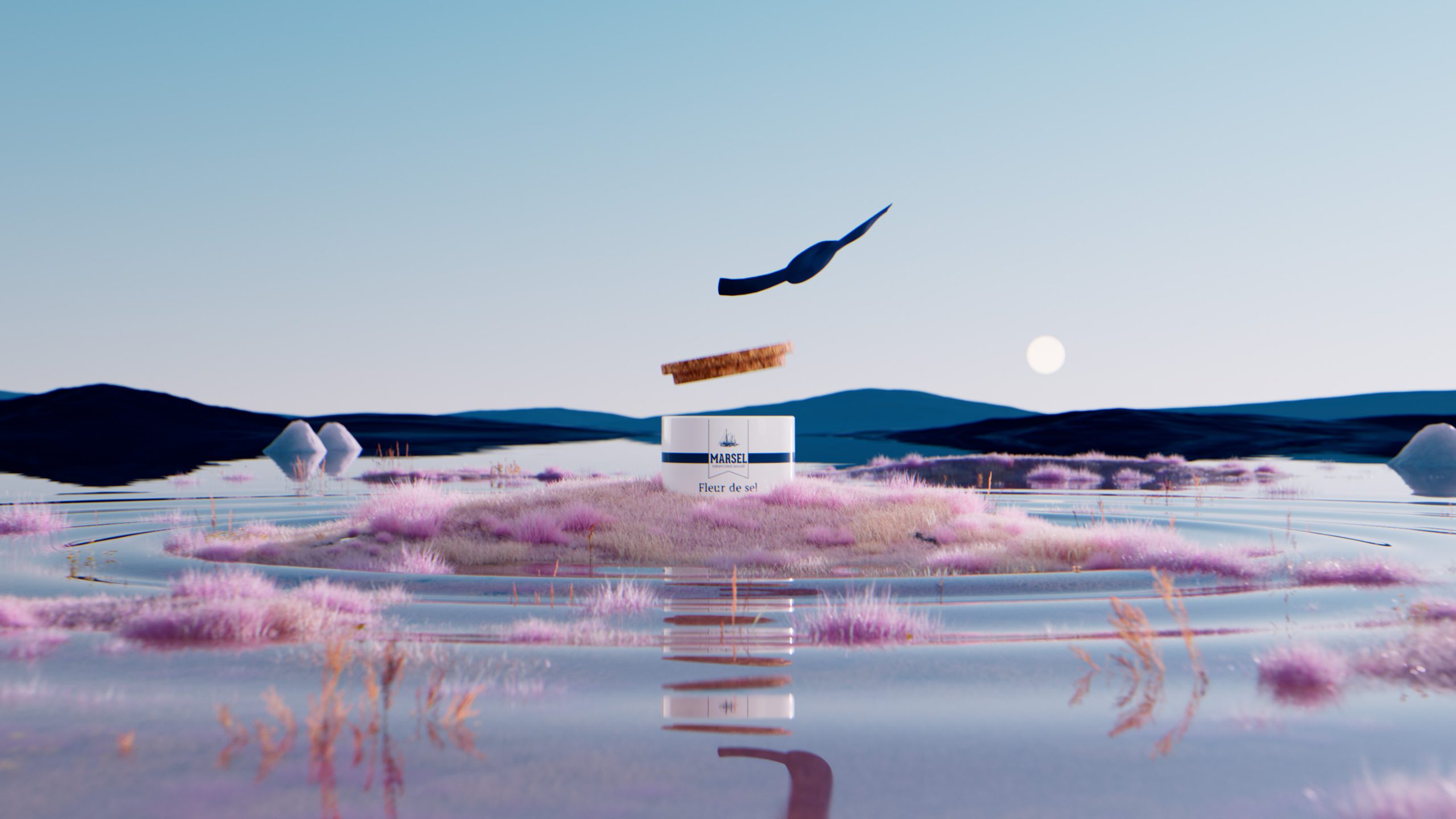 Our inspiration was drawn from the concept of a single salt flake initiating a chain reaction in the water, leading to its transformation and eventual evaporation, all while unveiling a picturesque island composed of vibrant flowers.